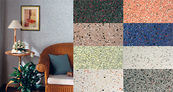 Флоки или же «чипсы» множество мельчайших кусочков из акриловой краски, которые наносят на стену, колонны, двери или карнизы при помощи набрызгивания распылителем. В результате образуется особенная цветовая гамма на поверхности, которая приобретает оригинальную современную фактуру и повышенную прочность. Другое же преимущество этого покрытия заключается в отсутствии потребности тщательного выравнивания стен, так как плотная консистенция состава помогает скрыть неровности и трещинки на стенах. Отличительной особенностью также является и водостойкость, что дает возможность воспользоваться флоковым покрытием в зонах с повышенной влажностью (ванная комната или кухня). Но следует учесть, что поверхность не должна намокать изнутри, иначе декоративный слой может «вспучиться». Самым лучшим решением может стать отделка флоковым покрытием проходных зон, где смесь разноцветных частичек визуально скрывает загрязнения, а сами стены можно мыть не просто водой, но и чистящими средствами. Также это покрытие устойчиво к выгоранию, истиранию, царапинам и быстрому разрушению (износу).